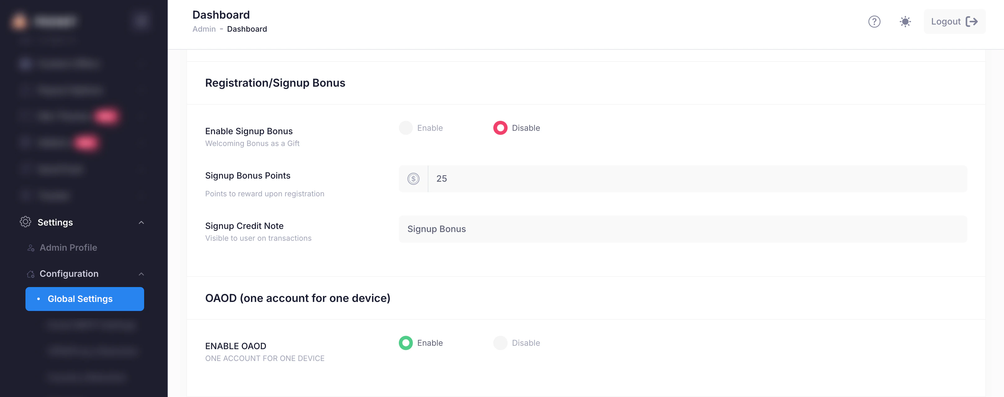 Registration/Signup BonusSection to configure Signup Reward - Scroll down to the